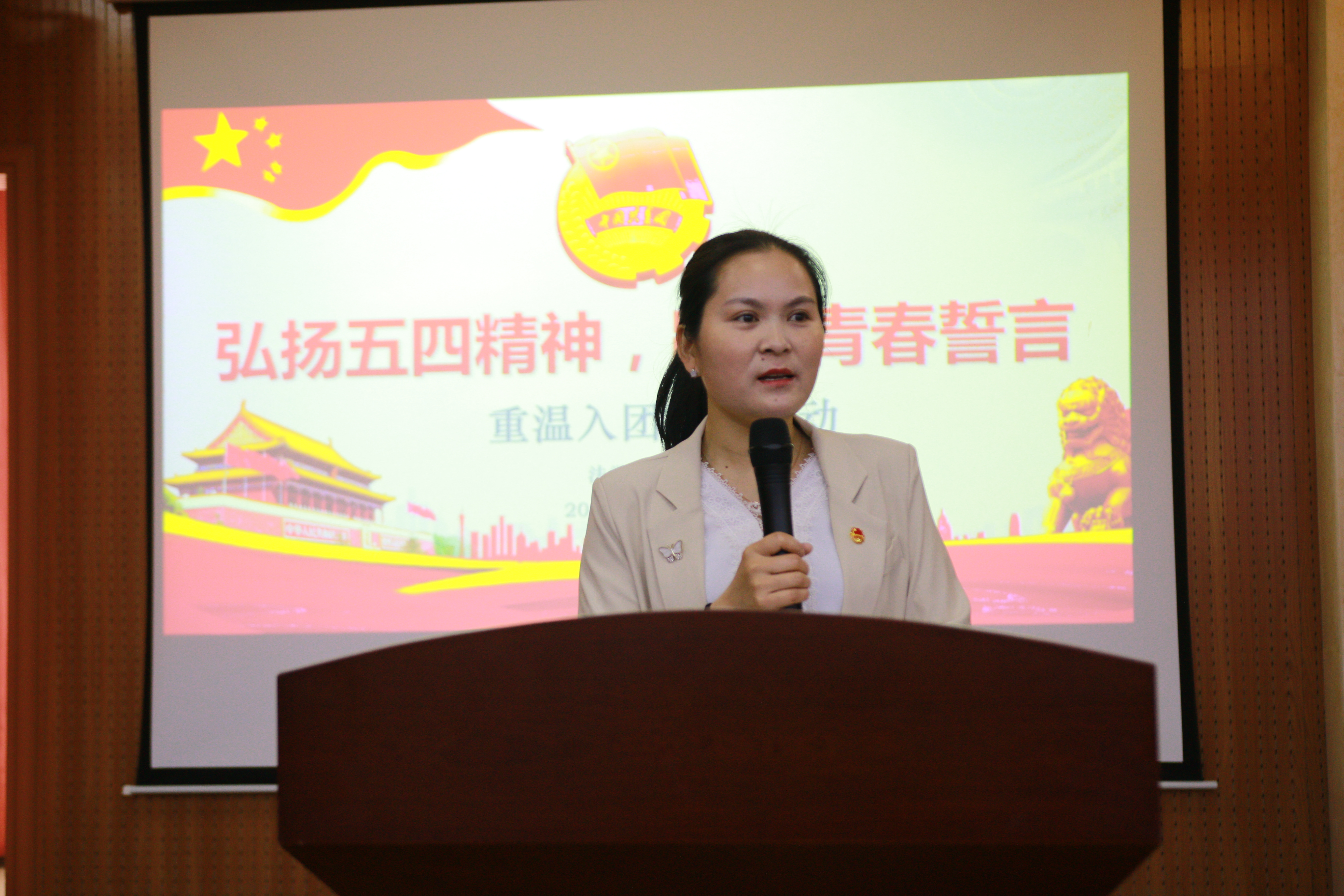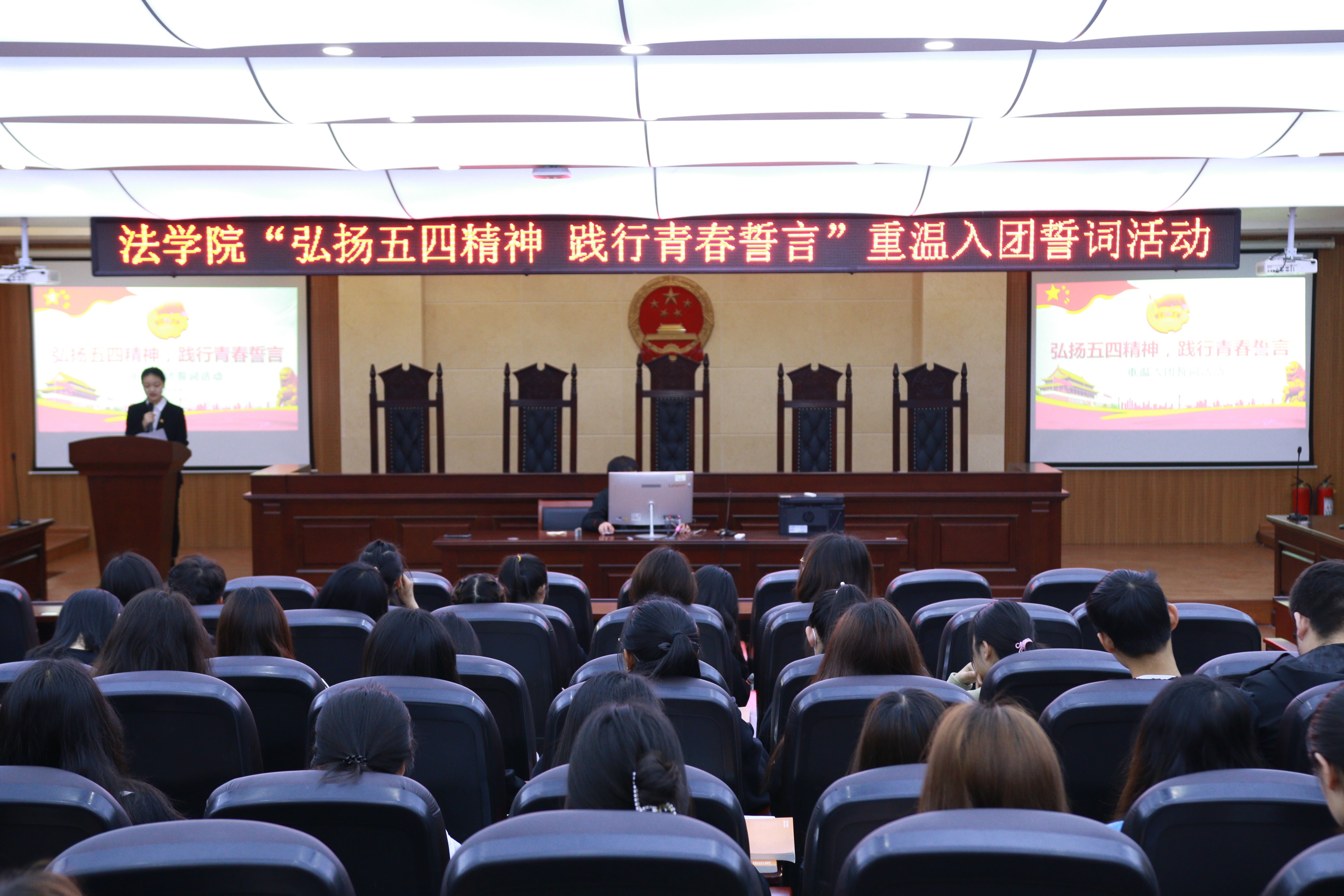 今年是建党100周年,也是五四运动102周年,在“五四”青年节来临之际,为弘扬“五四”精神,扎实开展“学党史、强信念、跟党走”主题教育,推进共青团组织建设,增强团员青年的政治性和先进性,激发团员青年的责任感和使命感,引导和激励我院广大青年学生感恩党、听党话、跟党走。4月30日,我院在模拟法庭开展“弘扬五四精神,践行青春誓言”重温入团誓词活动。本次活动由我院组织助理张馨悦主持,院团委副书记杨晓丽老师和200余名团员学生参加。
