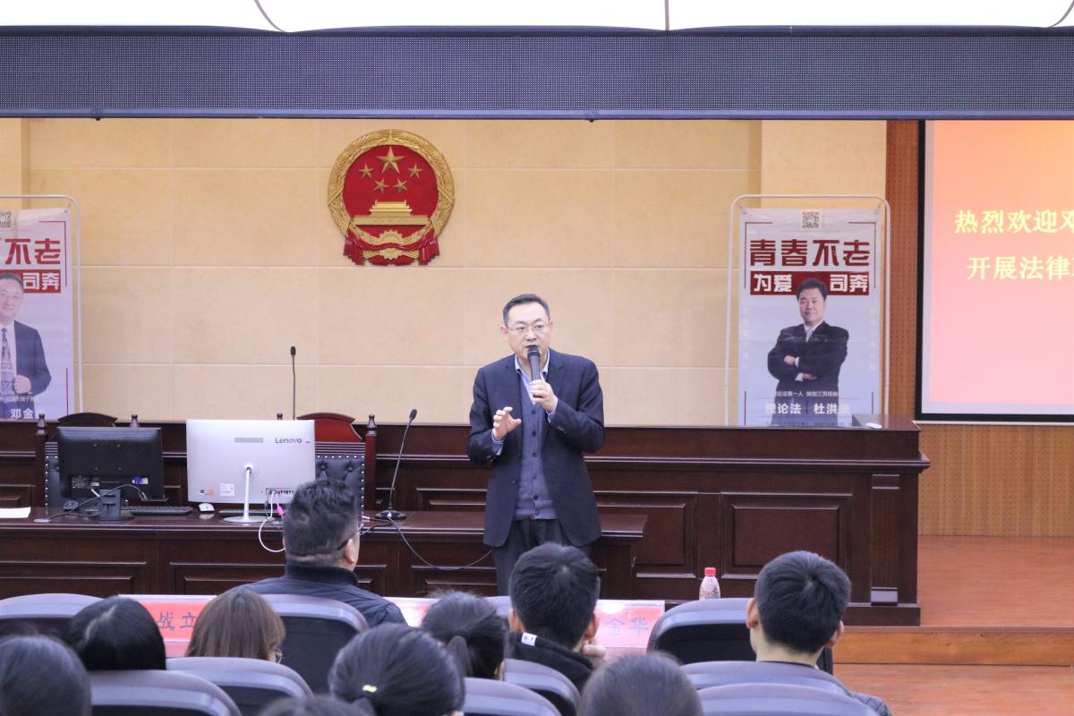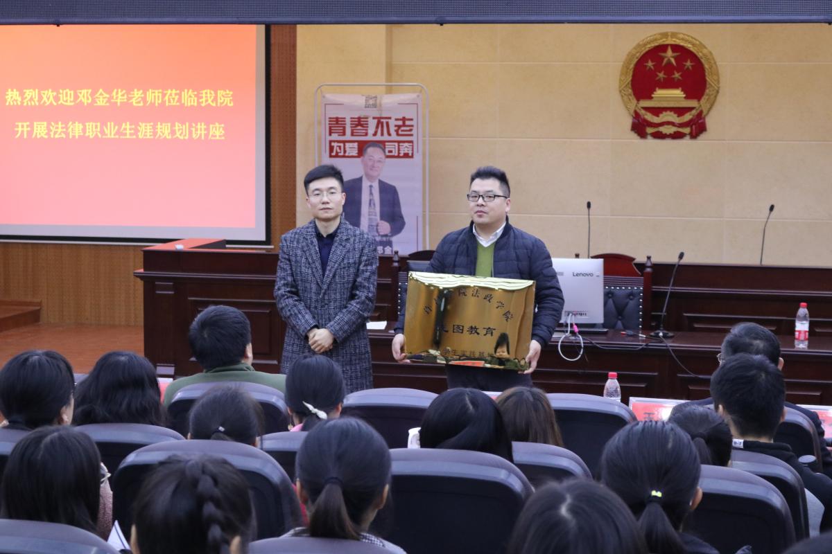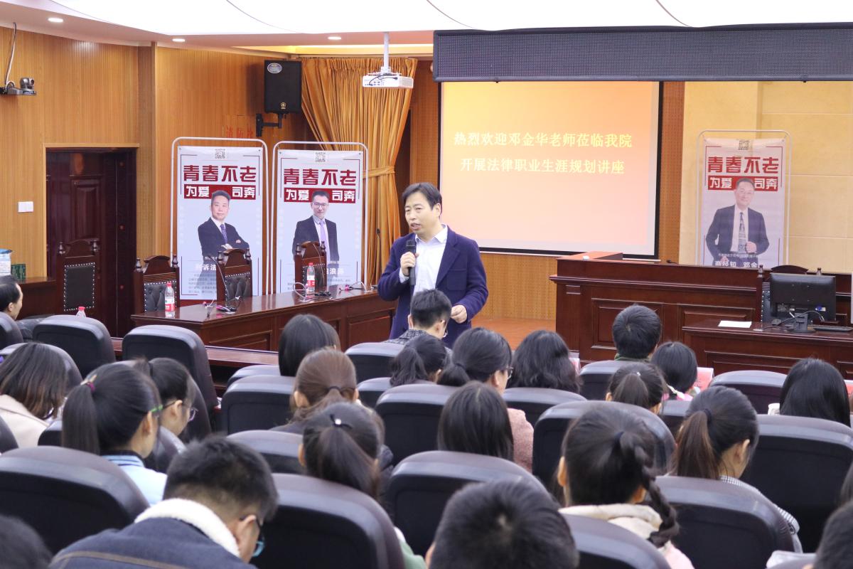 11月23日下午3时,法考、考研辅导名师兼北京龙图教育集团独立董事邓金华应邀莅临我院,于模拟法庭开展法律职业生涯规划讲座。bat365中文官方网站党总支书记唐战立、团总支负责人孙晨赫出席此次讲座,我院广大法学师生到场聆听。
