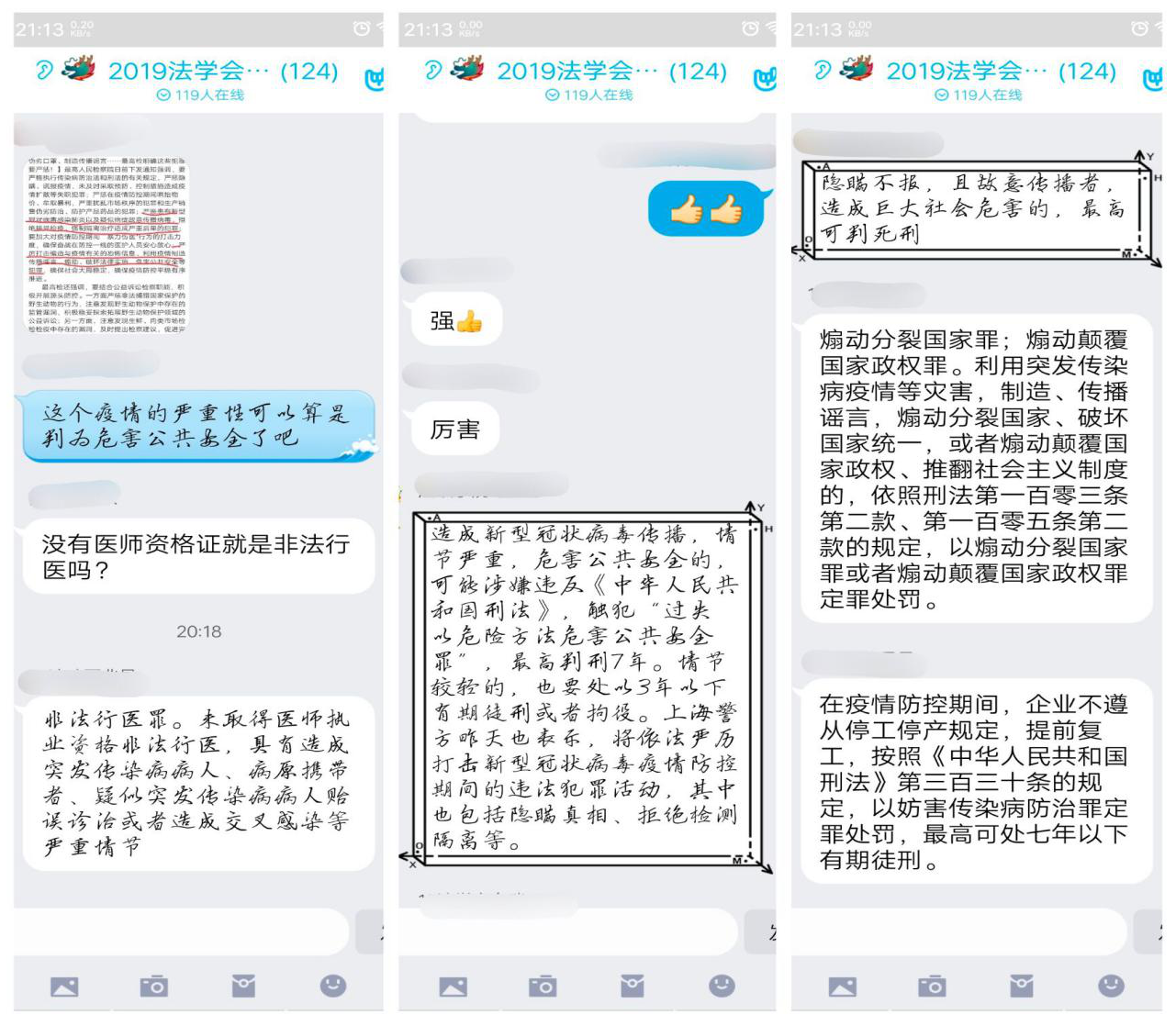线上活动开始后,法学会成员们纷纷就一些行为涉及的罪名进行由浅入深的探讨,通过援引法条和各类依据来发表自己对事件的看法。讨论涉及了非法经营罪、妨害公务罪、故意伤害罪、非法行医罪等等三十多项的罪名,遍布《刑法》、《民法》、《行政法》,甚至涉及《宪法》等多部法律,涵盖了经济、政治、文化等多个领域。同学们对法律学习的热情在激烈的讨论中得到抒发,同时也使大家深刻的认识到了遵守法律对于疫情防控的重要性。